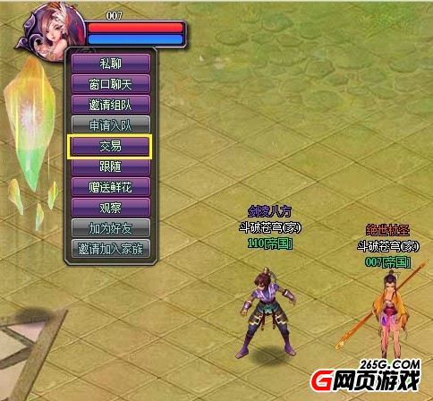 1. 点击当前场景的玩家,在其头像上点击左键,弹出的菜单中选择『交易』选项。
