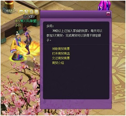此外,跑商也是赚钱的一大途径,在已加入家族的前提下,达到斗师境界后就可以去帝都找npc多玛(33,106)领取商贸任务了。