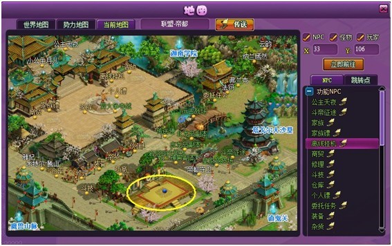 最后一种赚钱手段就是摆摊了,如果打到什么不错的装备或者商城道具的话,可以通过摆摊来出售给其他玩家,不过摆摊只能在一个特定的位置摆,那就是帝都的摆摊区了,位置大概在这里,下图得黄色圈圈处。