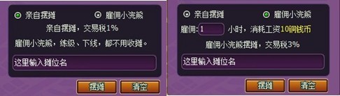 定后价后,输入你的摊位名字,再点击下方的摆摊就行了。如果不想自己摆摊,也可以选择雇佣小浣熊帮你摆摊,这样你救不需要被绑在这里了,练级,下线都不用收摊,但每小时需要支付小浣熊10铜币的佣金。另外系统也会向摆摊的人收取交易税,亲自摆摊的交易税是1%,雇佣小浣熊摆摊的交易税是3%。