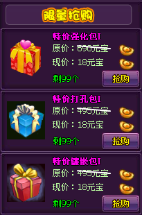 活动期间仅三天,伙伴、锻造、异火界面增加超值限量礼包【特价物攻包,特价斗攻包,特价闪避包,特价体悟包,特价洗灵包,小医仙召唤令,特价强化包Ⅰ,特价打孔包Ⅰ,特价镶嵌包Ⅰ】,活动期间每天限量出售,不要错过机会喔!