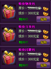 活动期间仅三天,伙伴、锻造、异火界面增加超值限量礼包【特价物攻包,特价斗攻包,特价闪避包,特价体悟包,特价洗灵包,小医仙召唤令,特价强化包Ⅰ,特价打孔包Ⅰ,特价镶嵌包Ⅰ】,活动期间每天限量出售,不要错过机会喔!