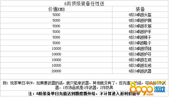 玩家单日充值达到一定数额即可免费领取6阶极品卓越神器,具体规则如下: