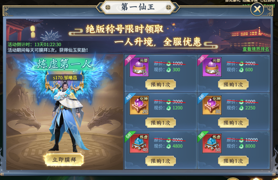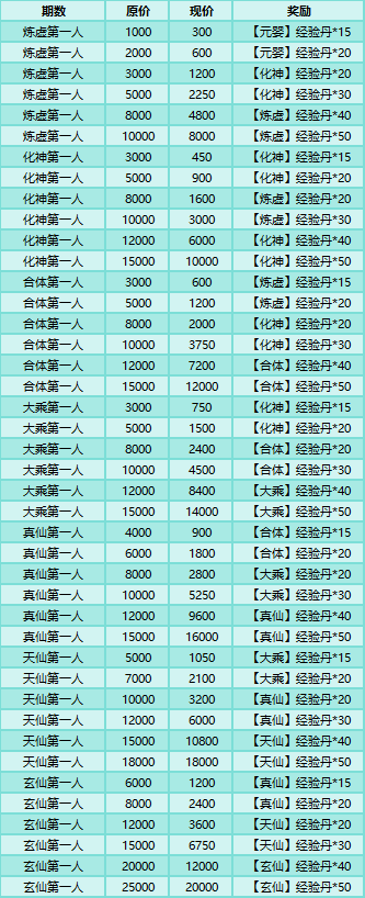 活动规则:第一个达到特定境界的玩家,即可获得该境界第一人称号。第一人出现时,所有玩家均可花费仙玉可购买经验丹,瞬间获取大量经验
