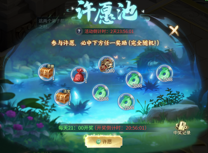 活动规则:消耗许愿币可参与当期许愿,许愿池开奖后所有参与许愿的玩家都能随机获得一份奖励(所有道具的抽中概率相同)