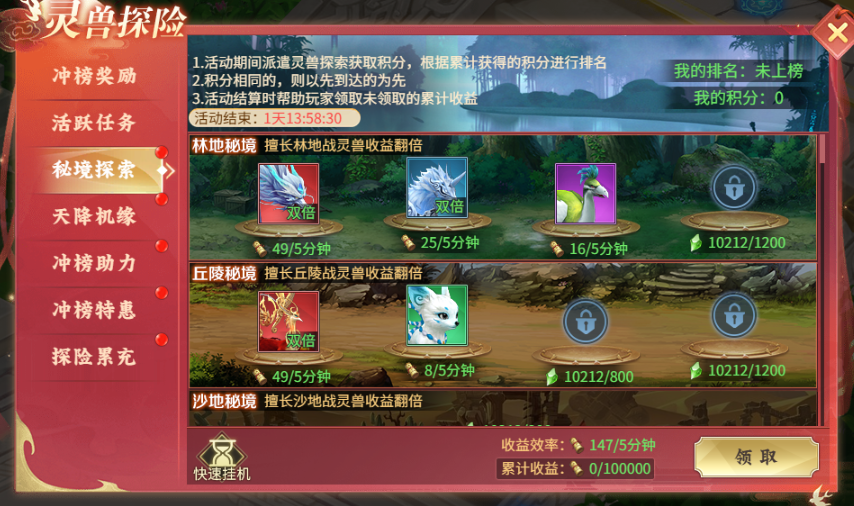 ②根据探索效率和挂机时间,可以领取对应的探索积分