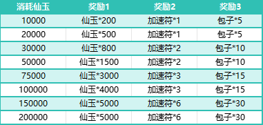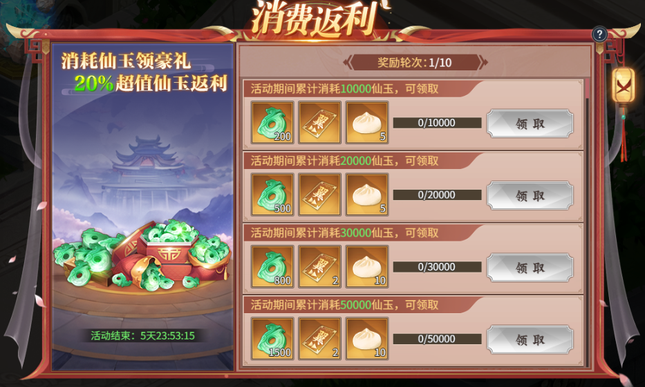 活动规则:活动期间累计消耗指定数量的仙玉即可领取豪礼,奖励共10轮