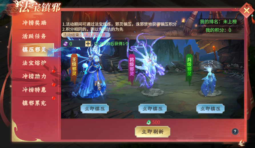 活动规则:完成活跃任务即可领取镇邪符,使用镇邪符可选定法宝来镇压邪灵并获得对应奖励和镇压积分