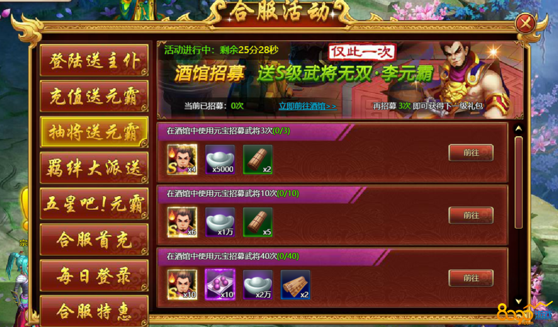 活动期间,酒馆抽将达到指定次数即可领取无双·李元霸将魂!