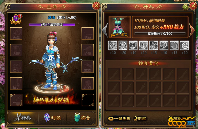在主角界面的右侧,所显示的是“神兵背包”,可存放收集而来的“神兵”以及“神兵碎片”,背包上限为42格,超过上限的神兵将被存放至“临时背包”,临时被曝的存放时间为12小时,超时将被清理,可将背包中等级低的装备出售。