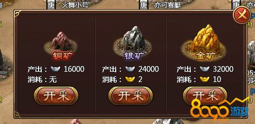 玩家可自行选择开采不同的矿,通过消耗一定元宝可获得更多的银币。