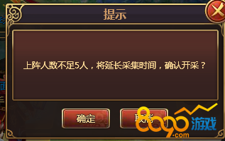 上阵人数最多不超过五人,上阵人数越多,开采时间越短,人数越少,时间则越长。当上阵人数不足五人时则会弹出吐下提示: