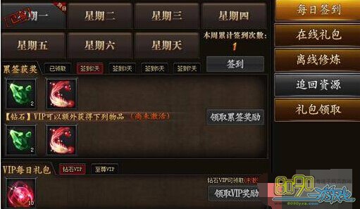点击主界面右上角“福利大厅”图标,打开面板就可以看签到领奖界面。签到次数越多,获得奖励越丰富,VIP玩家还可以使用补签功能来弥补漏签的天数。签到只计算当月的累计数,次月累计数清零重新计算。