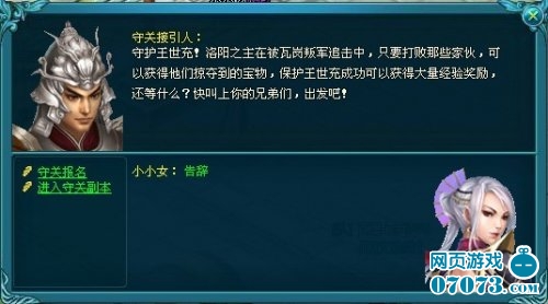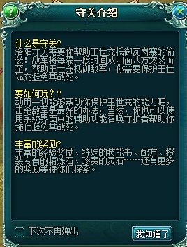 守关系统报名采取玩家组队形式,最多5人参加;战斗采取怪物不断刷新、玩家防守保护特定NPC王世充的方式,当NPC生命值为0或守过100关时守关结束;当守关结束后会一次性将经验奖励发放给玩家。根据守过的关数还会有不同奖品给玩家哦~