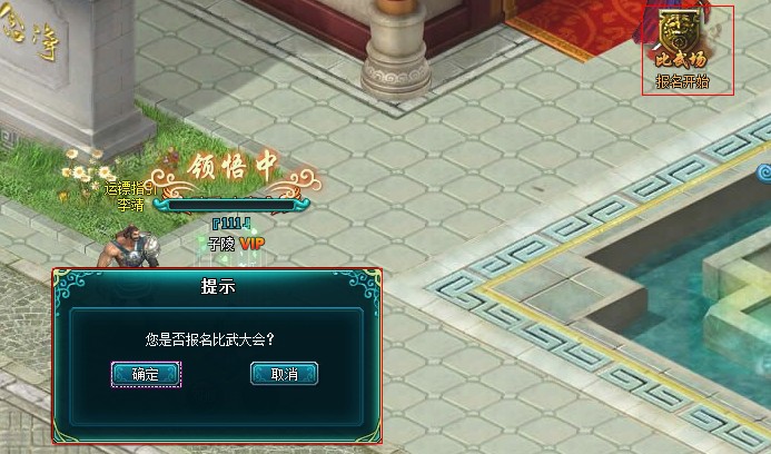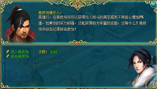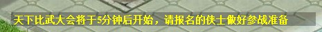 竞技场每日开战前5分钟,会有全服滚屏提示“天下比武大会将于5分钟后开始,请报名的侠士做好参战准备”。