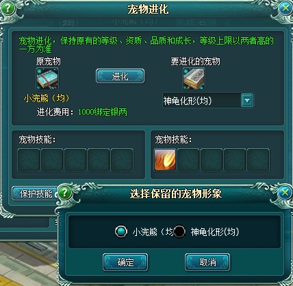 同样,在飞马牧场“四大门派”副本中获得技能书神龟化形之后,打开宠物界面,进化的步骤和其他的一样。在保存宠物形象的时候选择保存神龟化形。提示一下四大门派副本难度较高,最好组队同进。