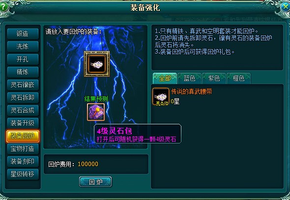 友情提示: 1、回炉前请先拆除灵石,镶嵌灵石的装备回炉后,灵石将消失。