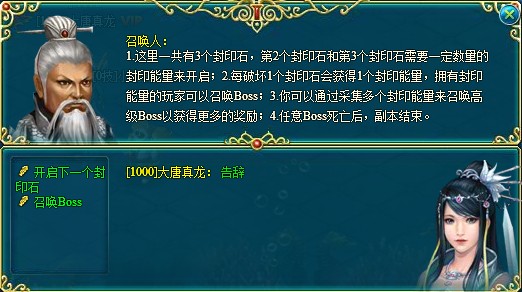 2、拥有封印能量的玩家,可以在NPC召唤人处选择开启下一个封印石或者召唤BOSS;