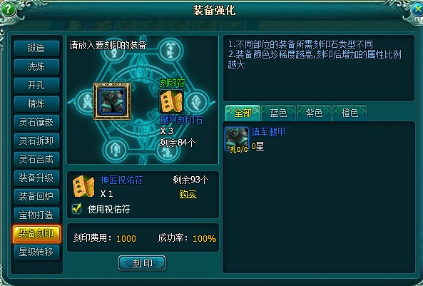 头盔、衣甲、靴子、腿甲、护腕、腰带才能进行刻印,不同部位的装备所需要的刻印石不同。使用神匠祝佑符可以使封印100%成功