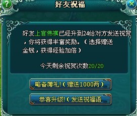 3.好友升级时,会收到好友升级提示,点开祝福窗口即可通过向好友发送祝福,则玩家与被祝福的好友都将获得经验奖励。