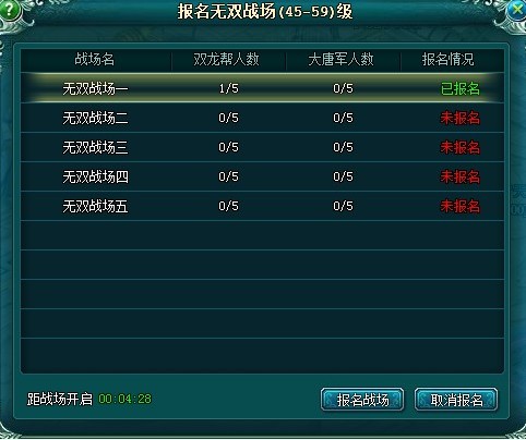 8090大唐真龙贰无双战场每天15:00-22:00期间开放,每半小时一场(前十分钟报名,后二十分钟比赛),玩家只要满30级即可以在洛阳无双战场接引人处报名参加无双战场,玩家可以选择报名双