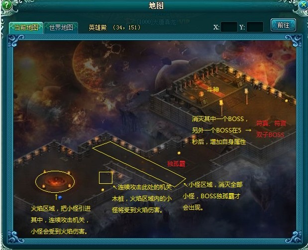 搜索"8090网页游戏"8090大唐真龙贰玩家33级可参加英雄殿副本,建议38级后组队前往。进入副本后,玩家可以和队友互相合作消灭小怪,安排一名或多名队员引怪到火焰区域,安排另外一名队员,一直攻击机关木桩,处于火焰区域的怪物将会收到持续的火焰伤害,大大降低了打怪难度。