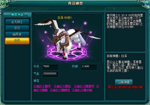 阵营领袖(君主或女王)可以选择合适等级的神兽召唤,神兽只存在30分钟,领袖要量力而行哟。
