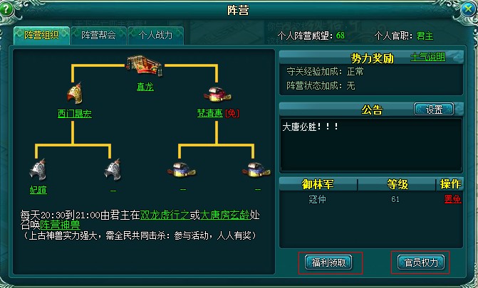 阵营的官职并不是一成不变的,每天都会根据排行榜选取新的玩家获得官职,以强者为尊。