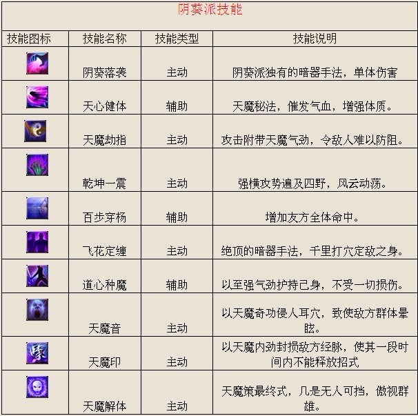 阴葵派是武林中最大的邪派,其门派技能邪气纵横,以飞镖毙敌与千里之外,令人防不胜防。