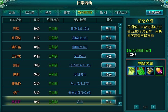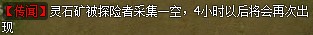 玩家可以在活动-野外BOSS界面中查看剩余刷新时间,并可以神行至采矿区,采集矿石可以获得1、2级灵石,初级镶嵌符,初级合成符,开孔符等