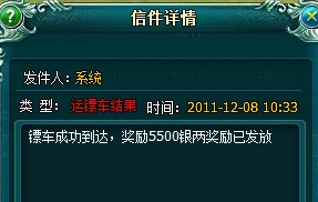 运镖成功后获得全额奖励。获得的奖励银两会直接加在玩家包裹里,系统发送邮件提示;