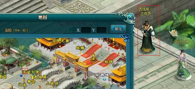大唐丝绸之路往来许多西域商人,位于洛阳的西域商人亚克西对中原风情极为痴迷,希望能搜集一些大唐独有的物品带回家乡,作为回报,亚克西会将他在西域各国的经历讲给玩家听,如此开拓眼界之事,自然会让各位侠士江湖经验大涨。 西域商人亚克西位于洛阳活动大使旁边