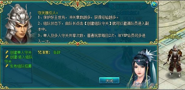守关分为单人守关与组队守关,战斗采取怪物不断刷新、玩家防守保护NPC王世充的方式,当NPC生命值为0或守过10章10关时守关结束;当守关结束后会一次性将经验奖励发放给玩家。