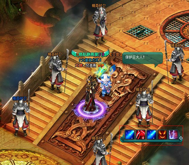 地图中间有六位护卫帮助玩家抵御敌人,玩家击杀怪物将有可能获得技能,获得的技能将会出现在技能槽中,玩家可以点击使用。