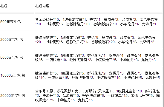 礼包奖励:还魂丹*10、一锭银票*6、中级锻造石*5、神行符*20、传音石*10、双倍经验丹*3、中级幸运水晶*4、游侠令*5、高级锻造石*2