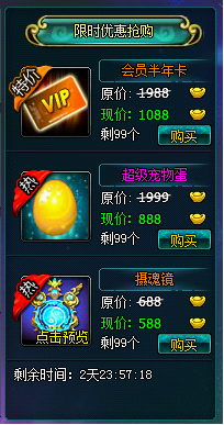 活动内容:在开服后三天,商场抢购区有特价VIP半年卡、超级宠物蛋、神魂镜橙色宝物等贵重商品大甩卖!限时限量,售完即止!