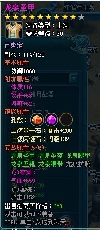 通过上图我们可以看到龙泉套装包括衣服30,头盔31,裤子32,手腕33,腰带34,靴子35组成,套装属性图上也很清楚。