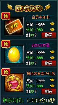 活动内容:在开服后三天,商场抢购区有特价VIP半年卡、神级宠物比卡兔、橙色装备豪华礼包大甩卖!限时限量,售完即止!