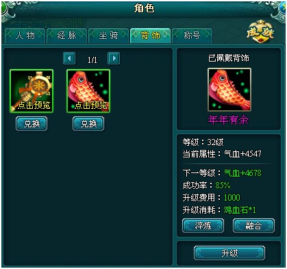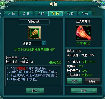 年有余”融合到“拨浪鼓”上,玩家最后获得一个50级紫色的“拨浪鼓”
