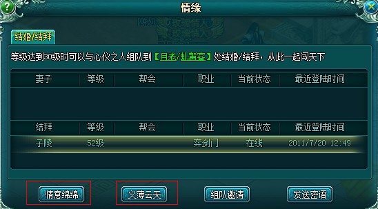 点击游戏中右下角的缘字可以进入情缘界面,里面有婚姻结拜技能。