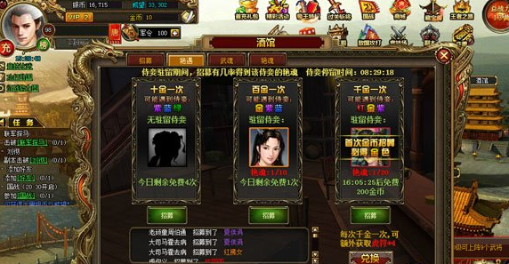 在帝王传中,各位主公需要前往酒馆招募侍妾。侍妾品质是红色最佳,极品红色品质侍妾只出没在一掷千金制造的机缘中。主公每天拥有一次免费招募的机会,失败也有几率获得当天驻留侍妾的艳魂几缕,收集足够数量的艳魂可直接招募该侍妾。