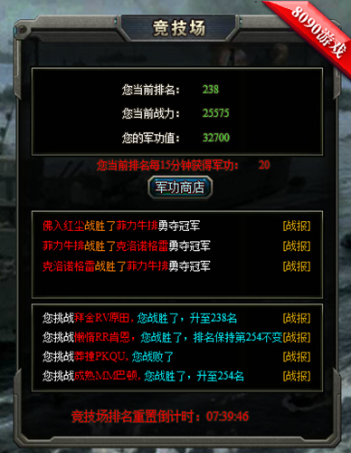当大家达到一定等级的时候就会开启竞技场的玩法了,进入竞技场,可以查看自己的排名,战力,军功,竞技获胜将获得声望,荣誉宝箱及军功奖励,如果不幸战败也会获得少许声望。