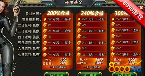 vip3以上的玩家们可以参加收益240%的基金,即投入1200返利280礼券连续返利一个星期!一个星期的总收益可以达到2880,是不是很高呢!别心急,还有更加诱人的基金哦!300%的收益只有vip5以上的玩家才可以参加哦,当然收益也是最多的300%的返利投入3000就可以有9000的返利了哦!连续一星期,每天有钱拿的感觉是不是超级爽呢!