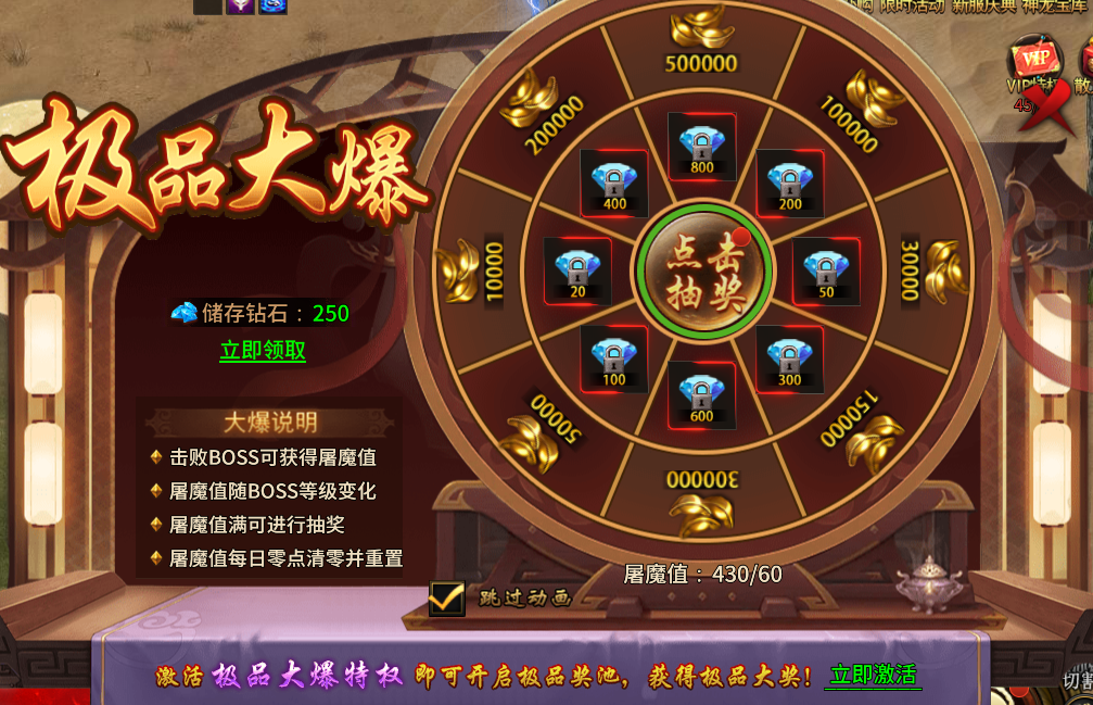 在大战国游戏中,击败BOSS可获得屠魔值,即可参与极品大爆转盘抽奖!激活极品大爆特权即可额外开启极品奖池,获得极品大奖!