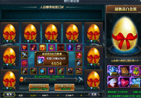 【活动内容】:活动期间,可使用金锤子或10钻石进行砸金蛋,金蛋内藏着包括“爱情之石”、“贵重道具”、“各种宝石”,“非绑钻石”等,更有机会获得“白金锤子”,白金锤子可用来砸高级的白金蛋,白金蛋内更是藏有大量珍稀的道具!