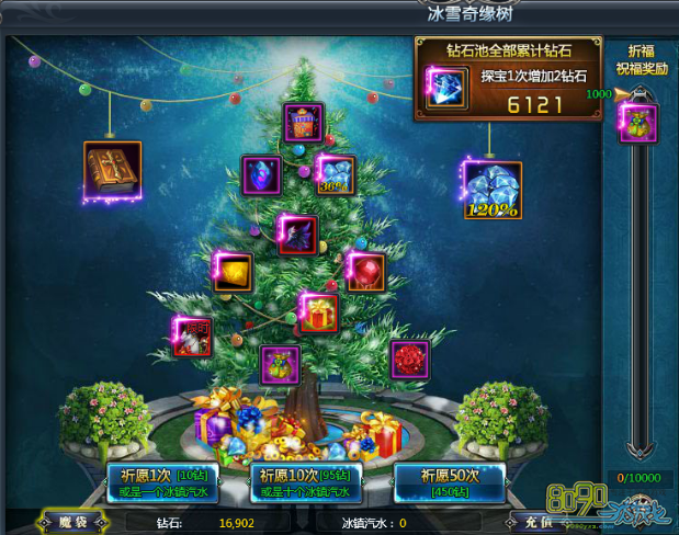 活动期间永恒城出现奇缘树,树上结满了童年礼物、幸福水晶等各种珍稀道具,并且有概率获得钻石奖池中的钻石,只要在树下用冰镇汽水或花费钻石即可摇动摇钱树,每次摇动都有概率掉落树上宝物;同时,每次摇树都可以获得一定的祈愿祝福值,当祝福值达到一定数量时,即可获得一份特殊的奖励!