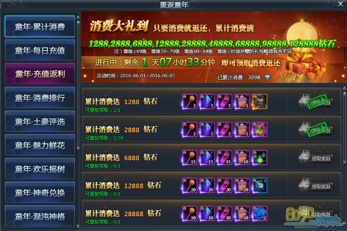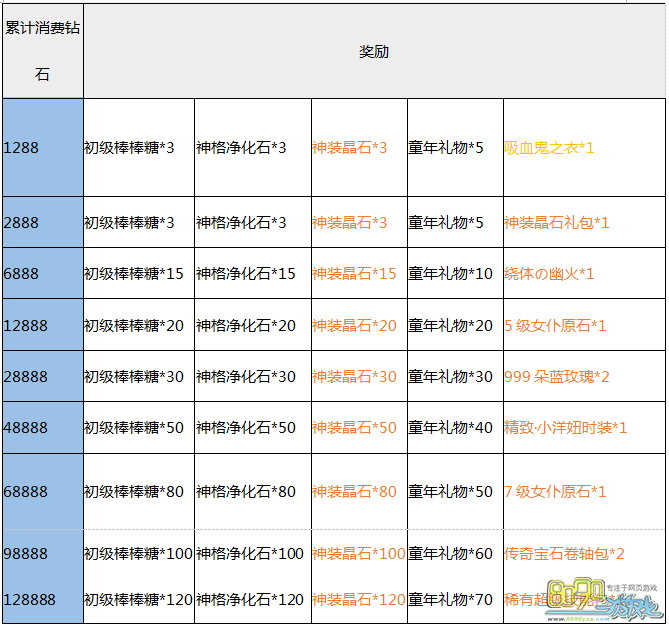 【活动内容】:活动期间累计消费达到一定额度即可全面返还豪礼!大量初级棒棒糖、神格净化石、吸血鬼之衣、童年礼物、稀有超级技能包,极品道具不可错过!