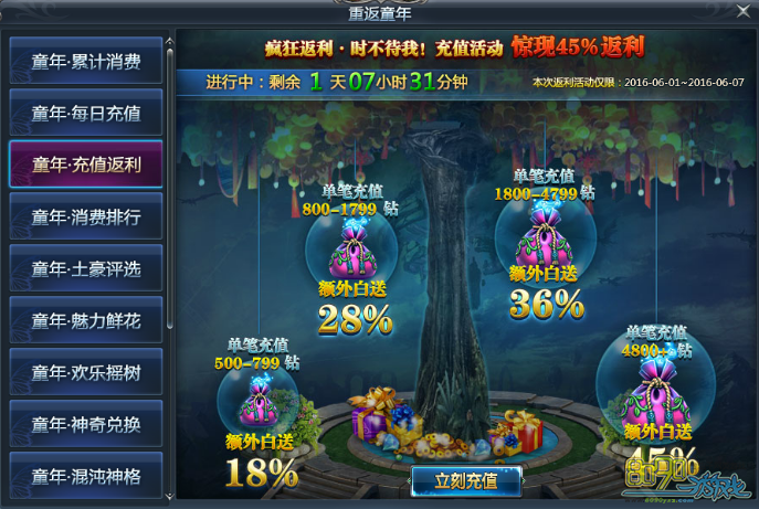【活动内容】:活动期间,史无前例的充值返利活动到来!你充值,我白送,疯狂返利!