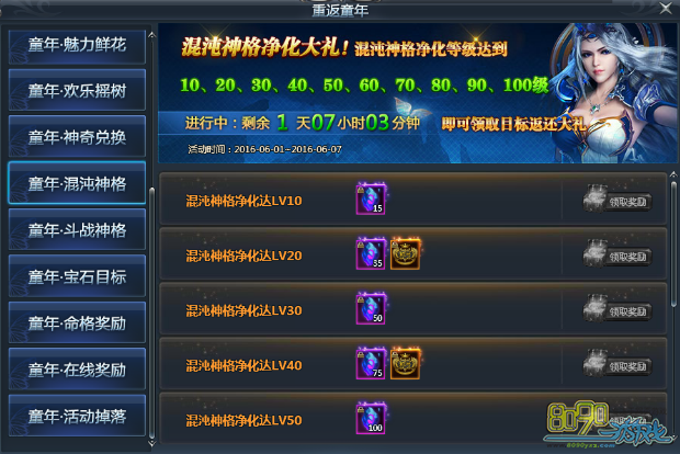 【活动内容】:神格净化更强大,每个神格都蕴含着神秘专属混沌,需要经过净化才能绽放!活动期间,混沌神格净化等级的数量达到指定目标,即有机会获取神格净化荣誉称号!
