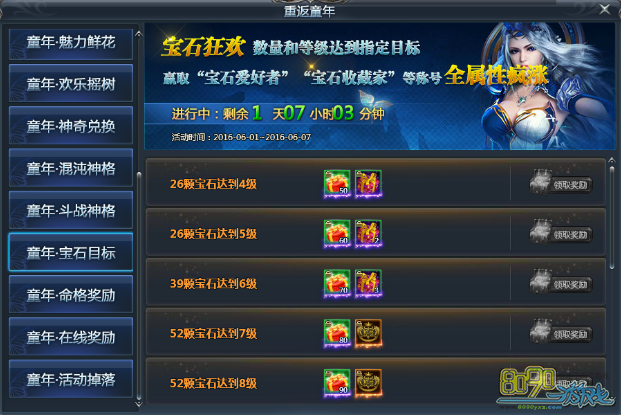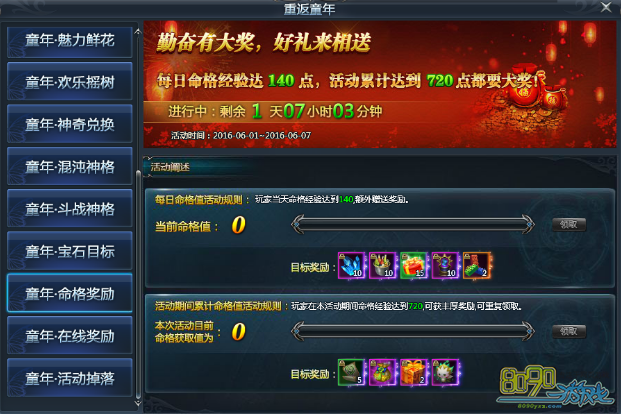 玩家当天命格经验达到140,额外赠送奖励:精灵进阶石*10,冰镇汽水 *10,绑定初级宝石随机礼包*15,神印提升石*10,乐高玩具*2
